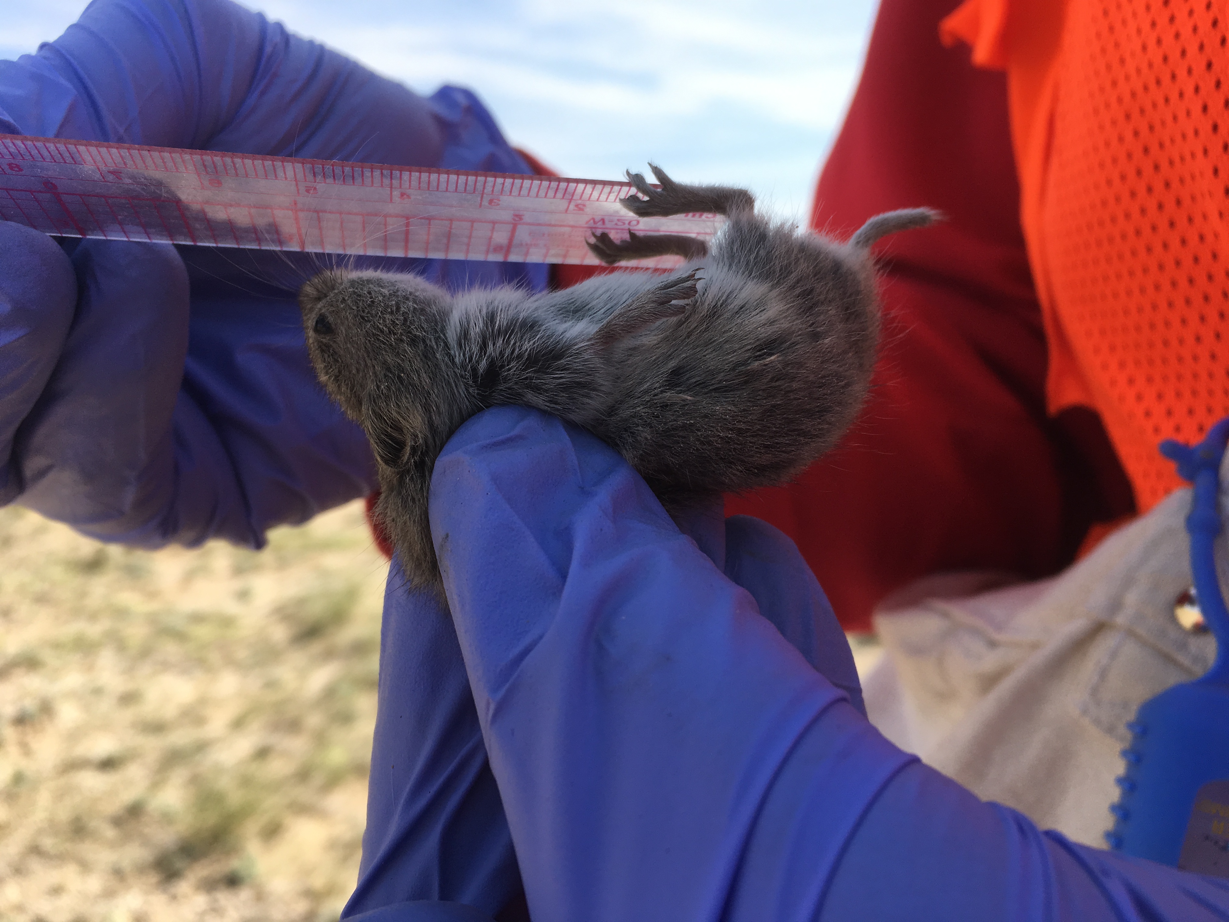 The first week of trapping in salt desert shrub habitat at Chain Lakes was a great success, resulting in 12 captures of olive-backed pocket mouse , and one capture of sagebrush vole. Four additional and equally fascinating species were also captured: Ord’s kangaroo rat (Wyoming’s only kangaroo rat), the fierce northern grasshopper mouse (a primarily carnivorous mouse known to kill and eat animals larger than themselves, including other mice, and which ‘howl’ in territorial defense), the North American deer mouse (our most common mouse), and the strikingly patterned thirteen-lined ground squirrel.