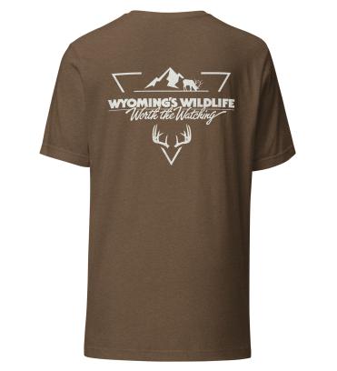 This Bella + Canvas t-shirt is branded with the Wyoming Game and Fish gift shop logo on the front. The back design includes an elk with the Wyoming's Worth the Watching logo. Printed with a direct-to-garment printing method.